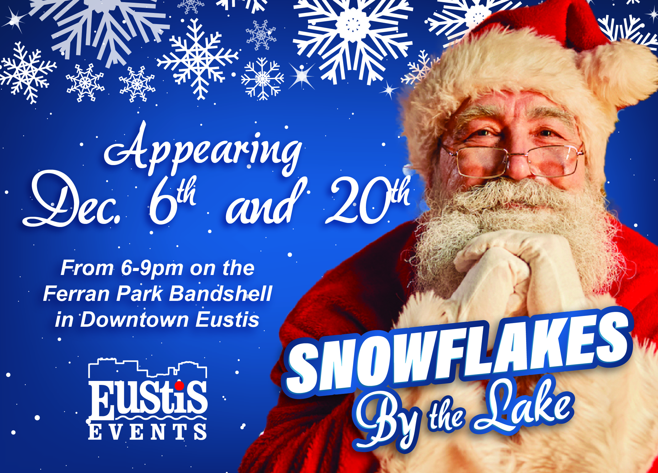Snow will be falling each Friday night between Thanksgiving and New Year’s – December 6, 13, 20 and 27 – in Ferran Park every half hour for 10 minutes. The first night of Snowflakes by the Lake will coincide with the December First Friday event happening in Downtown Eustis.