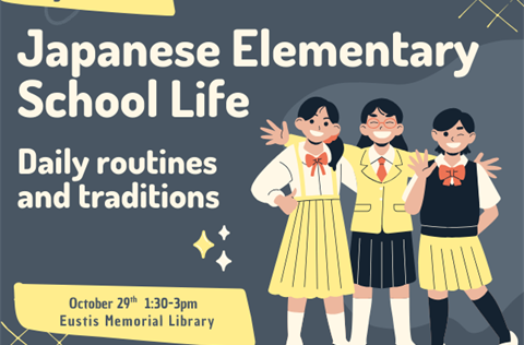 Japanese Elementary School Life 29 Oct 2025 Discover the daily routines of Japanese elementary school life through stories, pictures, and hands-on activities, from lunchtime traditions to students helping clean their classrooms. Eustis Memorial Library, 120 N. Center St., 32726 Tagged as: , Kids & family, Talks & workshops