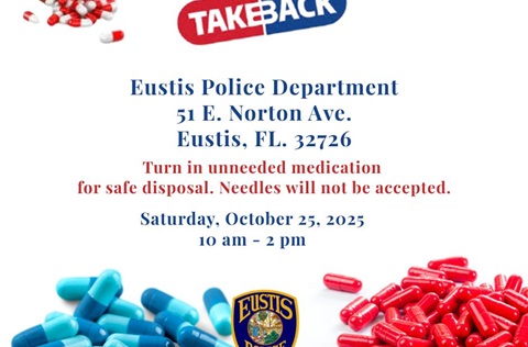 DEA Drug Take Back Day 25 Oct 2025 Bring your unneeded or expired medications to the Eustis Police Department on Saturday, October 25, 2025, for safe and responsible disposal. Eustis Police Department, 51 E Norton Ave., 32726 Tagged as: , Community events & fundraisers